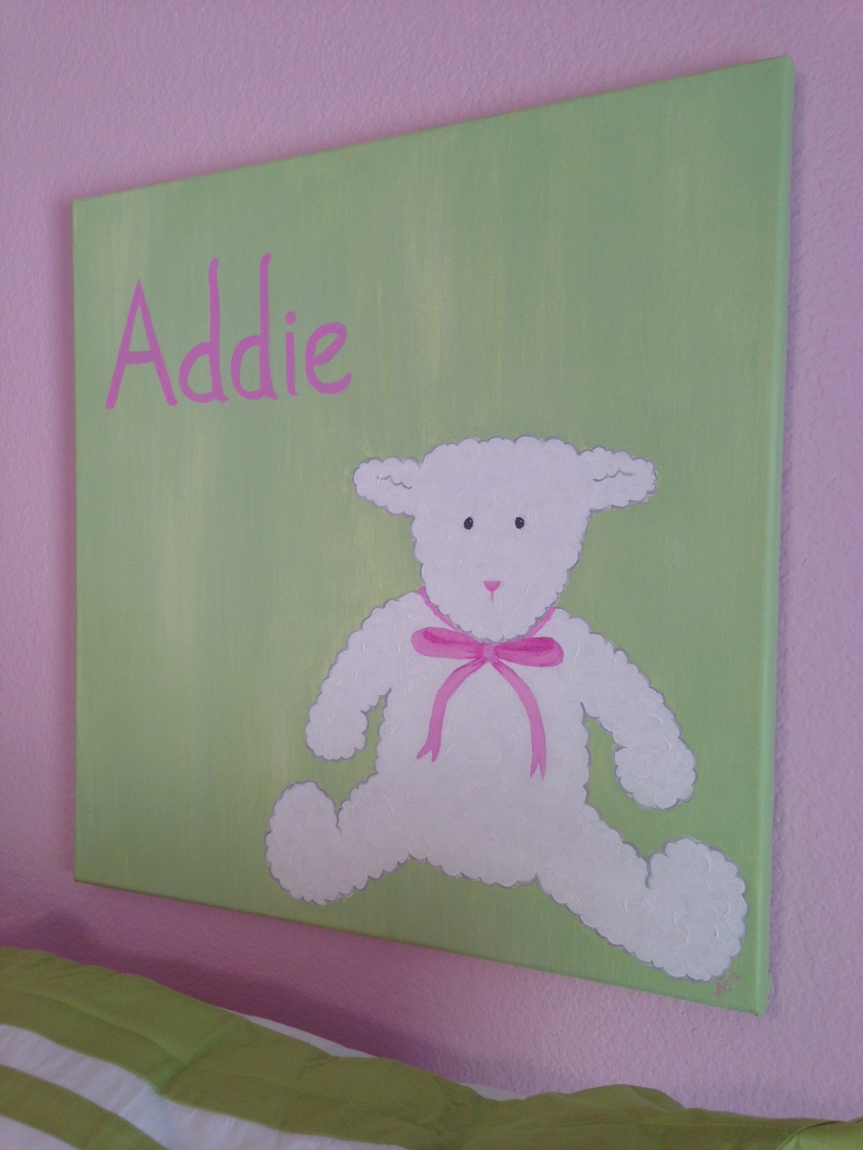 The other piece of art in the room is a custom painting I did of my daughter’s stuffed lamb. I also painted something similar for my oldest daughter and am so glad I was able to capture the special affinity my girls have for their little stuffed friends.