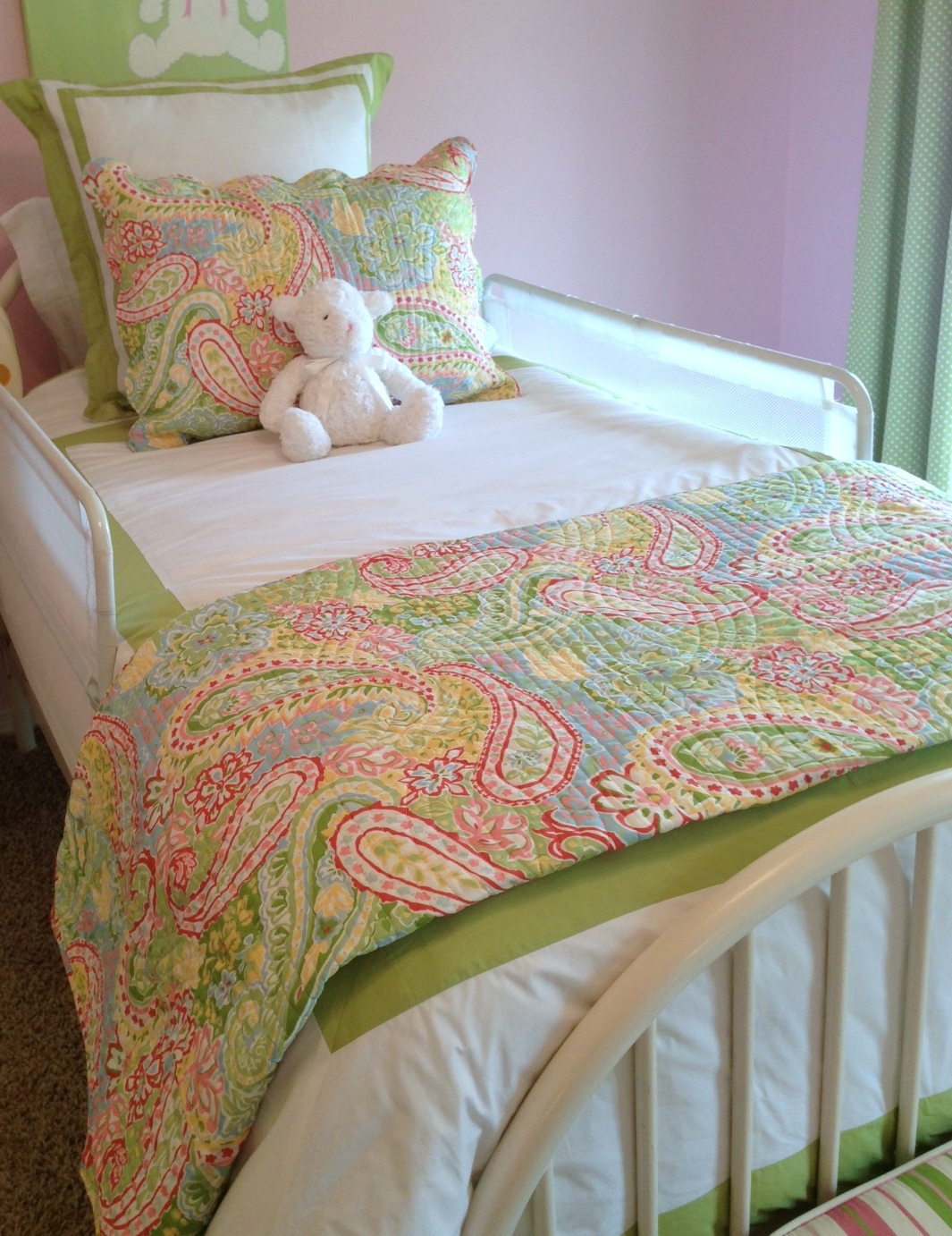 The bed is actually an antique iron hospital bed that belonged to me as a teenager. It had a few scrapes and dings so I gave it a fresh coat of spray paint. Like the drapery rods, I used Dove White in Gloss by Krylon. The duvet cover is from Pottery Barn Kids (I scored with a 20% off + free shipping coupon) and the quilt and matching sham were only $15 at TJ Maxx.