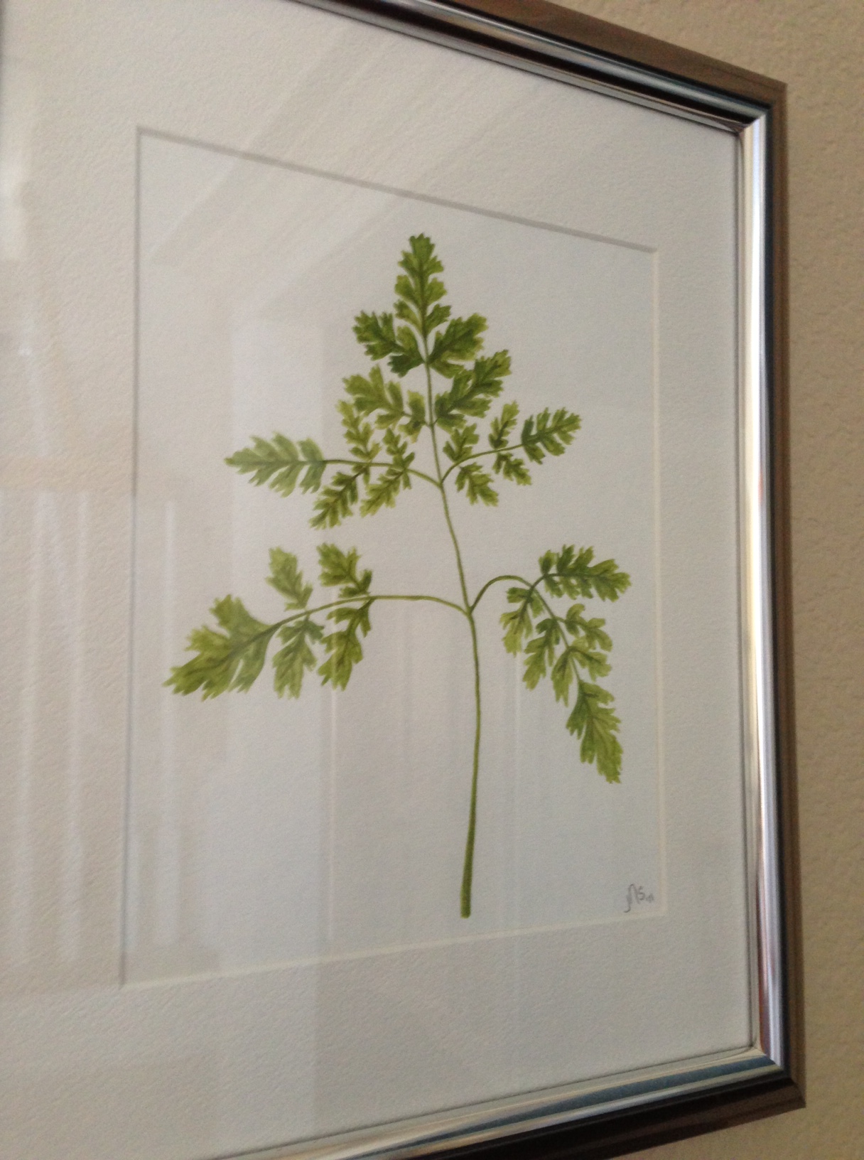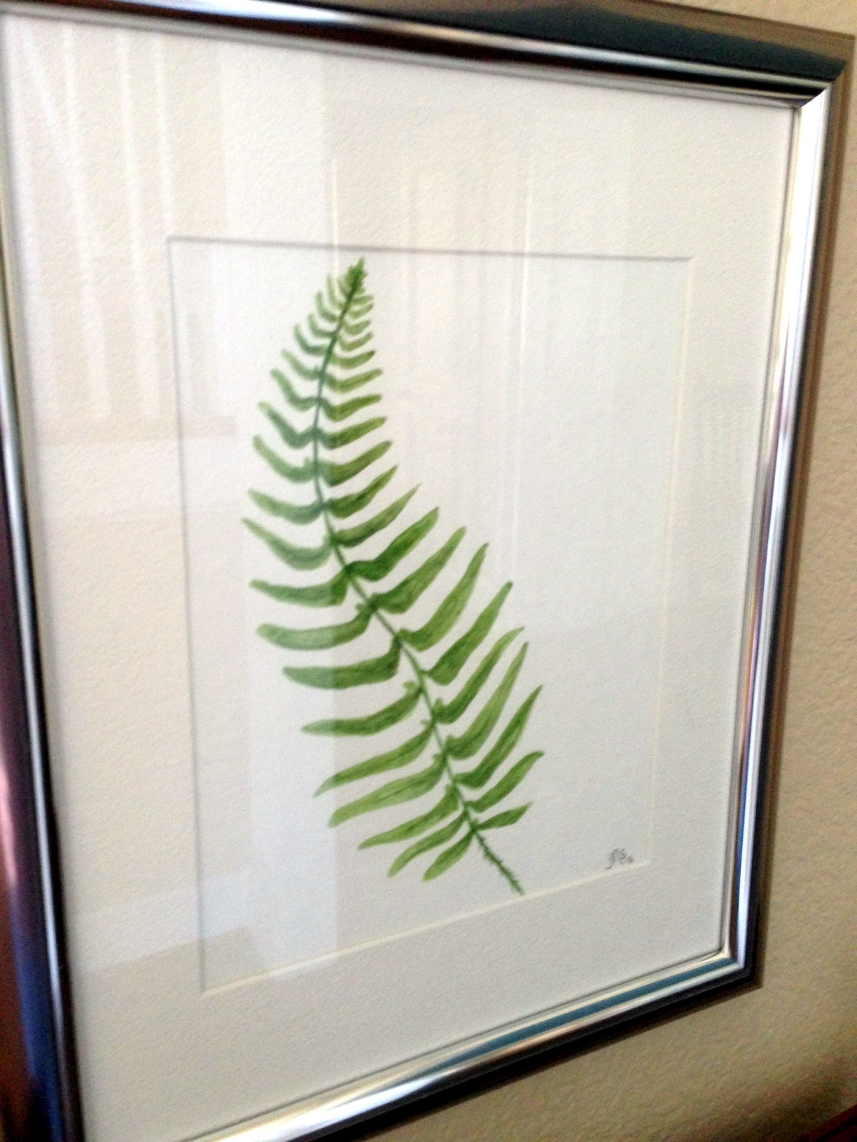 After my paintings were dry and sprayed with a UV protectant, I inserted them into some pewter frames I purchased at Michael’s for $8 each. I love the pop of green the paintings add to my entry.