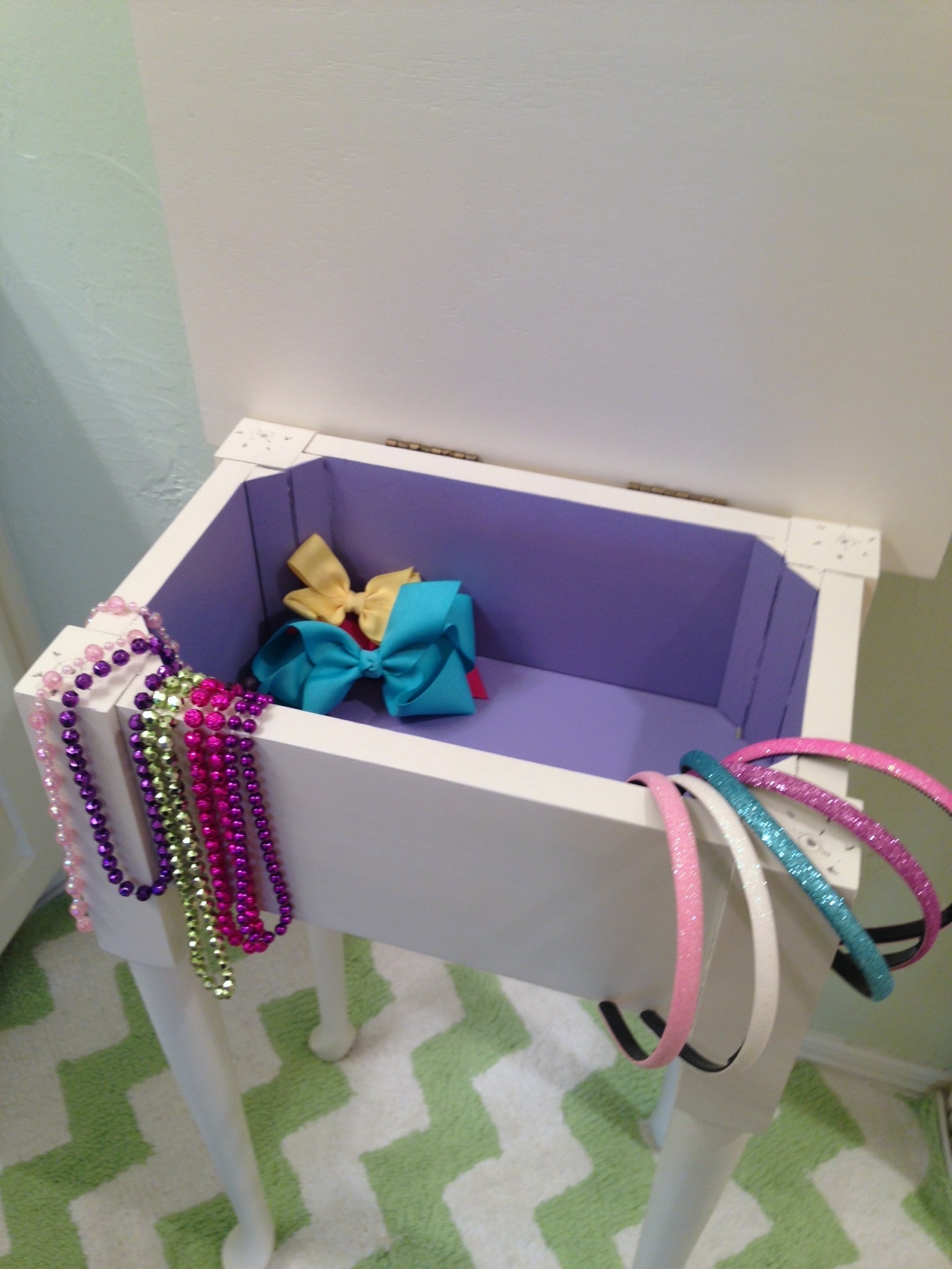 I love the unexpected pop of color. The friend who gave me this table has touches of lavenders and violets in her house, so she was my inspiration. She is also super smart and suggested the table would even make a great jewelry box for a little girl. Additionally, I think it is an excellent way to store the multitudes of hair accessories which seem to invade houses of little girls (don’t worry, one of these days I will paint something more gender neutral).