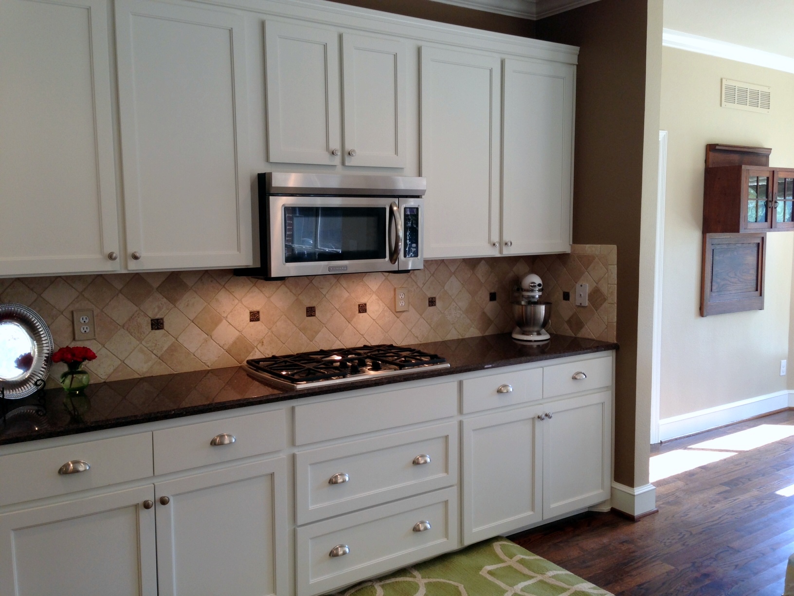 We now have traditional shaker style cabinets painted in Alabaster by Sherwin-Williams. I also added brushed nickel hardware which I found on Amazon.com for only about $1 a piece. I believe the brand is Cosmas. I’ve never heard of them, but for the price their hardware is top notch. These little guys have put up with all sorts of abuse from my family of four. So far, I don’t have a single complaint.