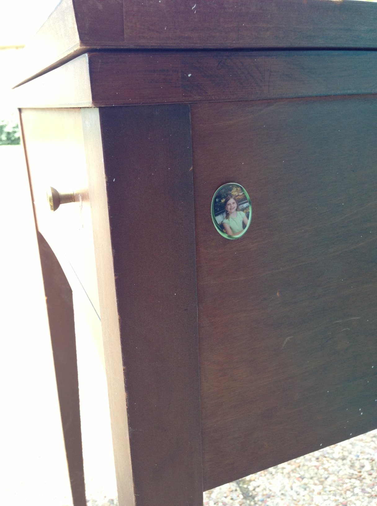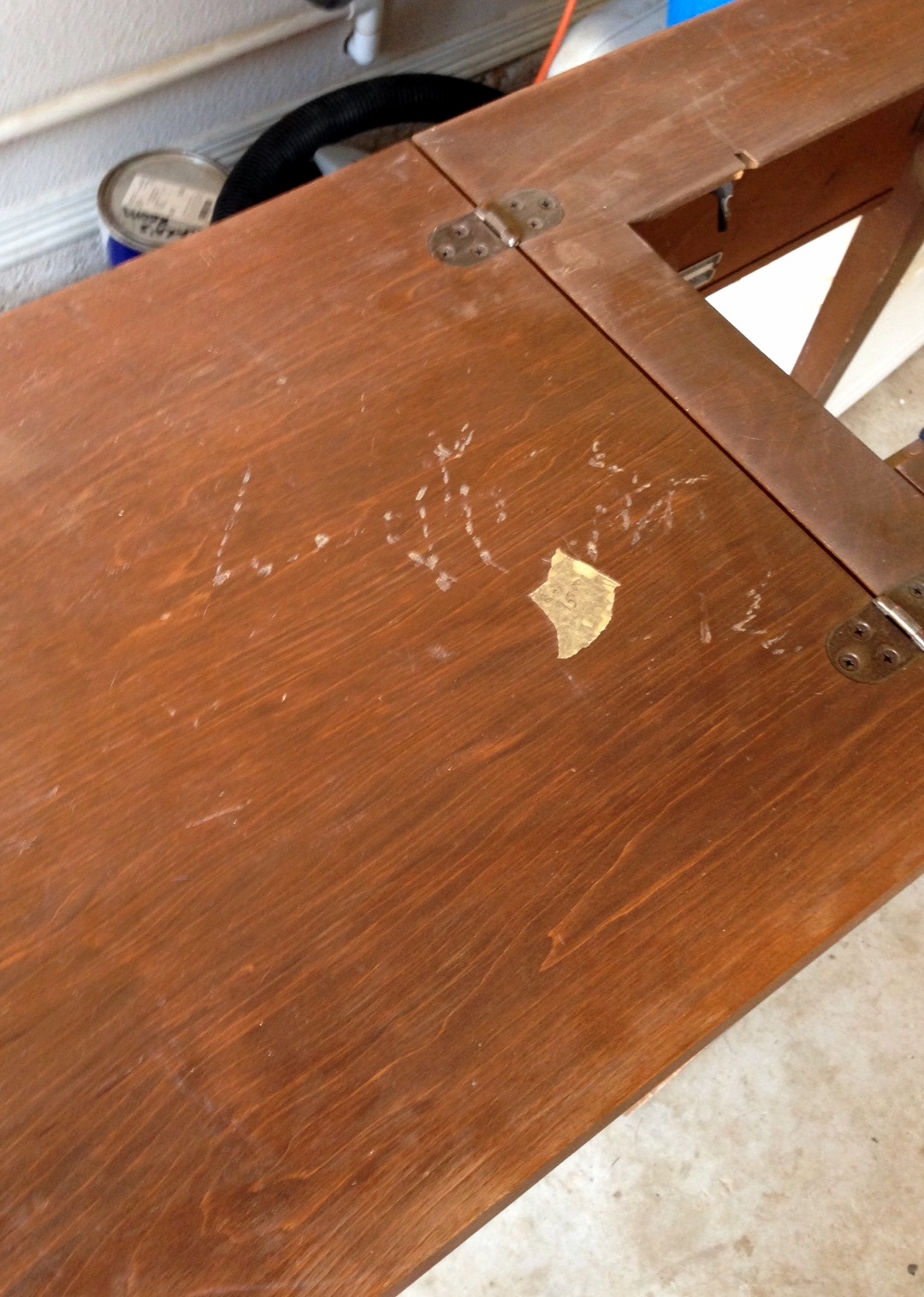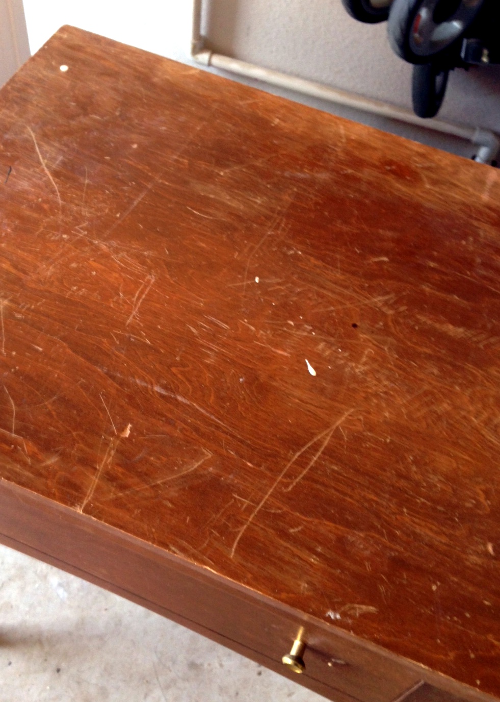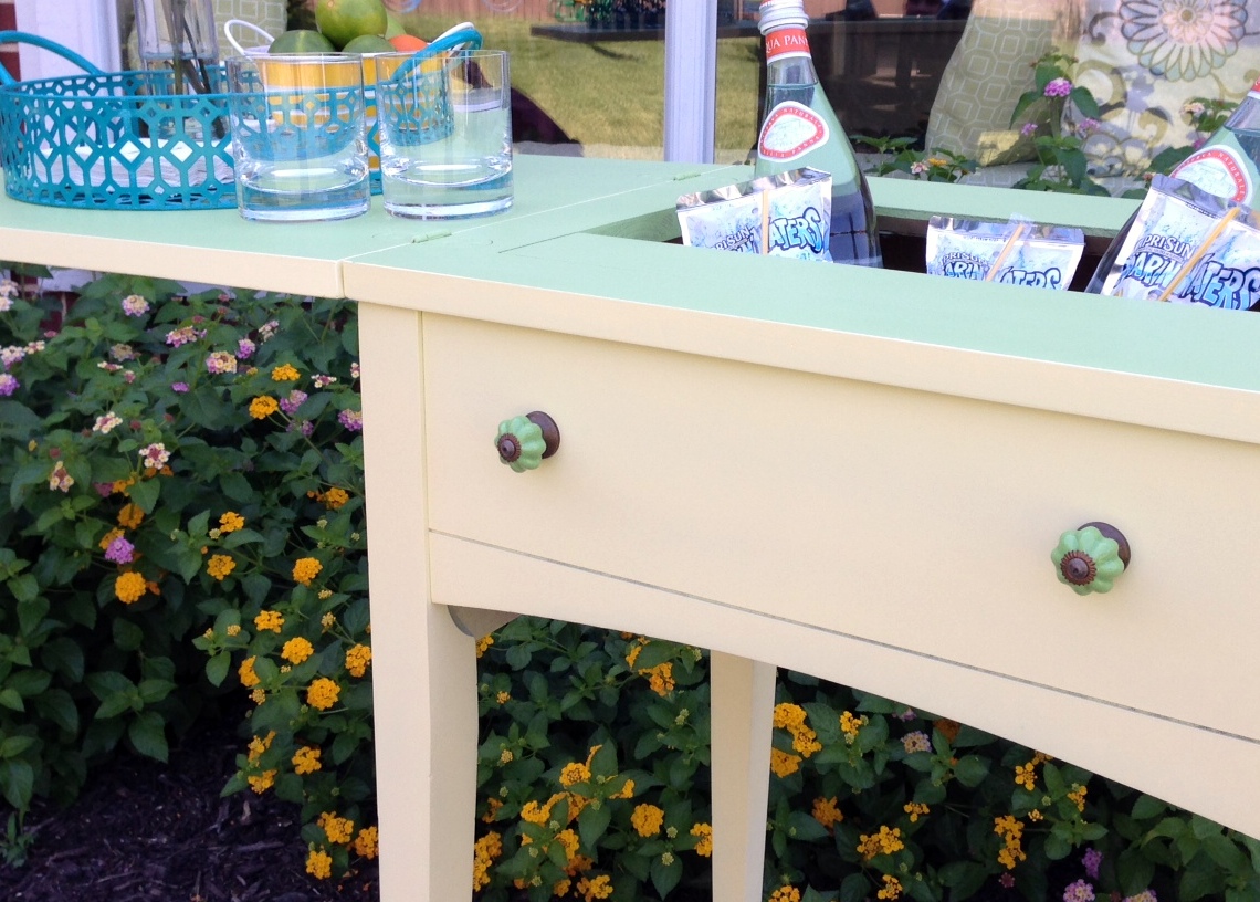 Ta-dah! It’s now a beverage serving table/bar/drink cart or whatever you want to call it. When I first got the piece I stared at the empty hole for a while as I tried to figure out what to do with it. Maybe it was the influence of the season, but I decided the hole needed to be filled with cold beverages. To get started the first thing I did was sand, sand and sand again.