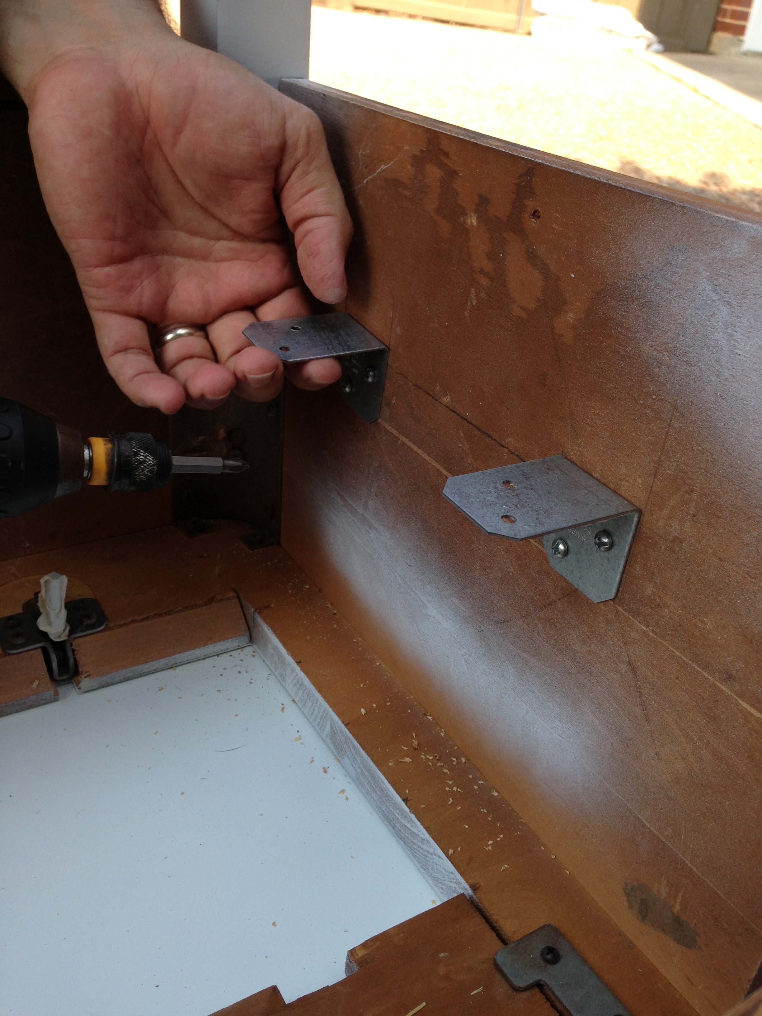 Next step was two coats of primer (with yet more sanding between coats). After the primer was dry I was able to get my husband to do his handiwork. After all, I needed a shelf of some sort to hold the beverages. We are by no means engineers (not even close), but we decided to cut plywood down to size and attach it with L-brackets. I’m sure there was probably a better way to do this, but it worked for us (look how helpful I was by holding the camera).