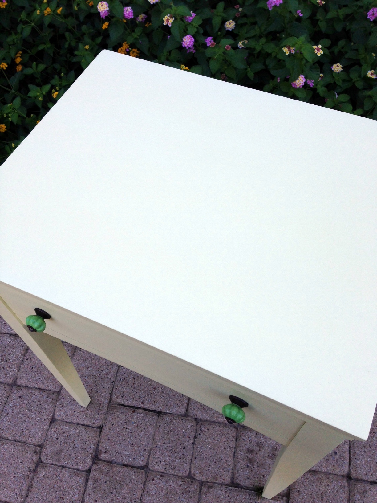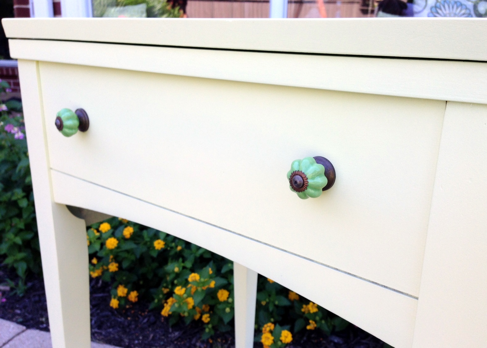 Once the paint dried for 24 hours I taped off the interior edges, closed the lid and painted the exterior with Krylon’s Meringue in Satin. Again, I lightly sanded with a 220 grit sanding wedge between each coat. To seal the piece I waited until the paint was dry then added 3 coats of water-based Polycrylic (and yes, even more sanding between coats). I didn’t distress the piece because I’m a fan of letting furniture age naturally, especially if it is going to be used outdoors. For the final touch I added these awesome vintage inspired green knobs I found at Hobby Lobby.