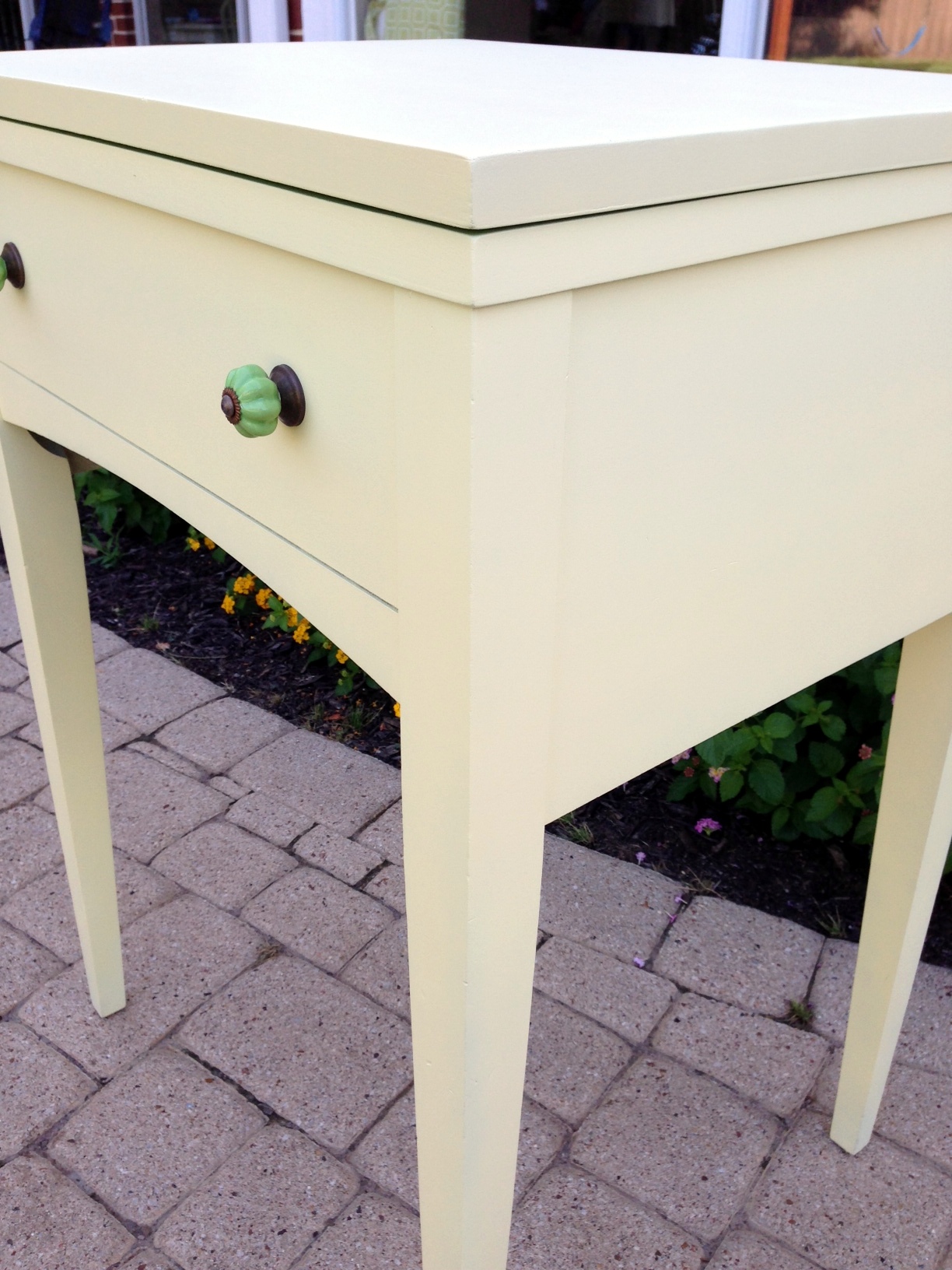 I think one of the things I like best about this piece is the versatility of being able to use it either indoors or out. When not in use the table folds up and makes a perfect accent table. These sewing tables are also just the right size to use with a chair so it would make a great little laptop desk. Of course, the table is so cheery you could also leave it under your porch to add a touch of color all year long.