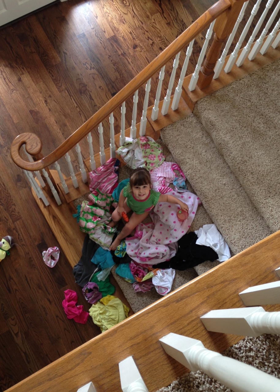 TIP: When you fold your laundry, put it away immediately or the laundry gremlin will wreak havoc and throw it over the stairs. And yes, I do intend to refinish my stair banister….eventually.
