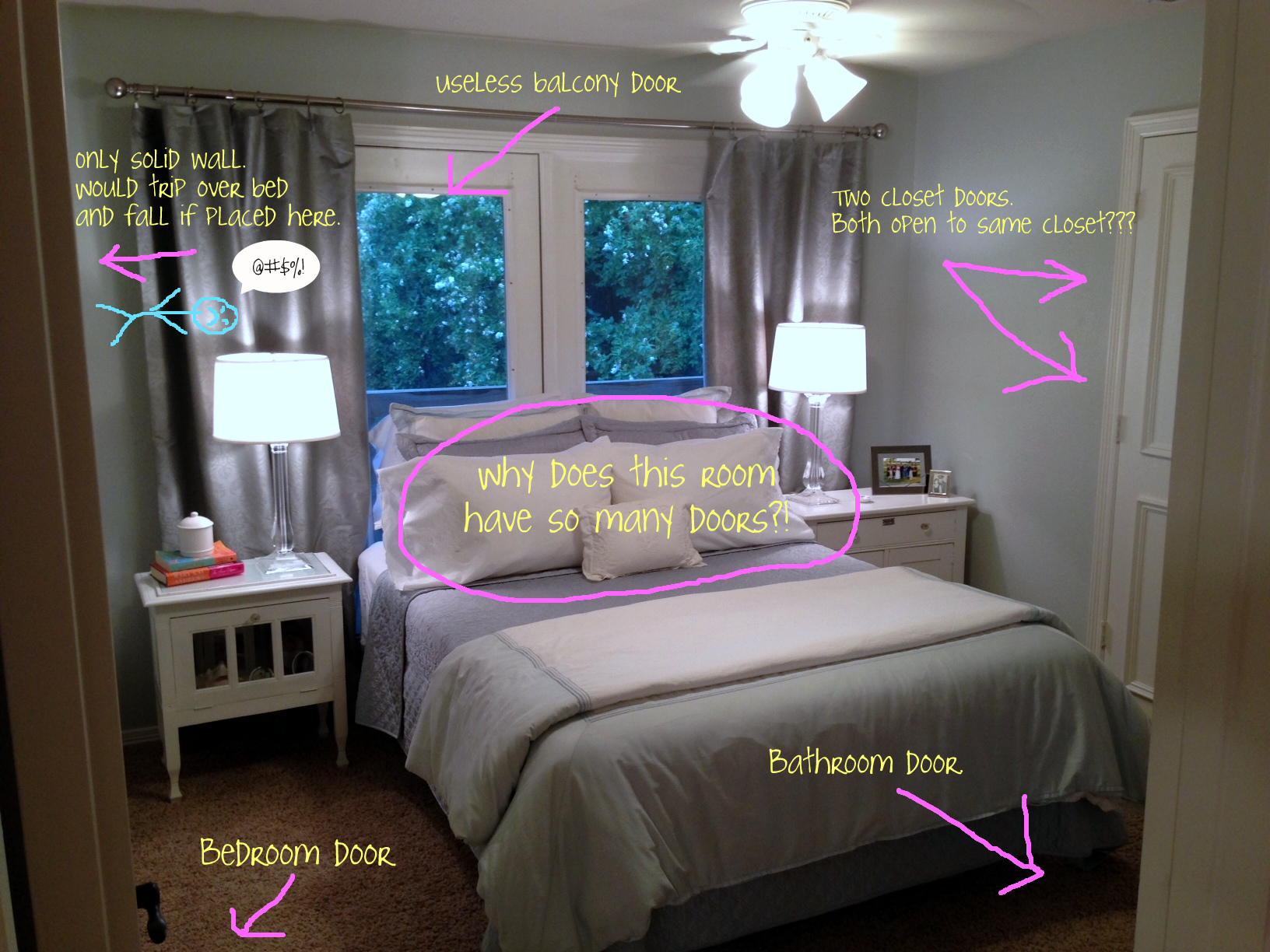 The biggest challenge I have is that this room has 5 doors.  FIVE.  There is only one solid wall, but if I placed a bed there you would literally walk directly into it as soon as you step into the room.  Since I am a klutz, that is a bad idea.