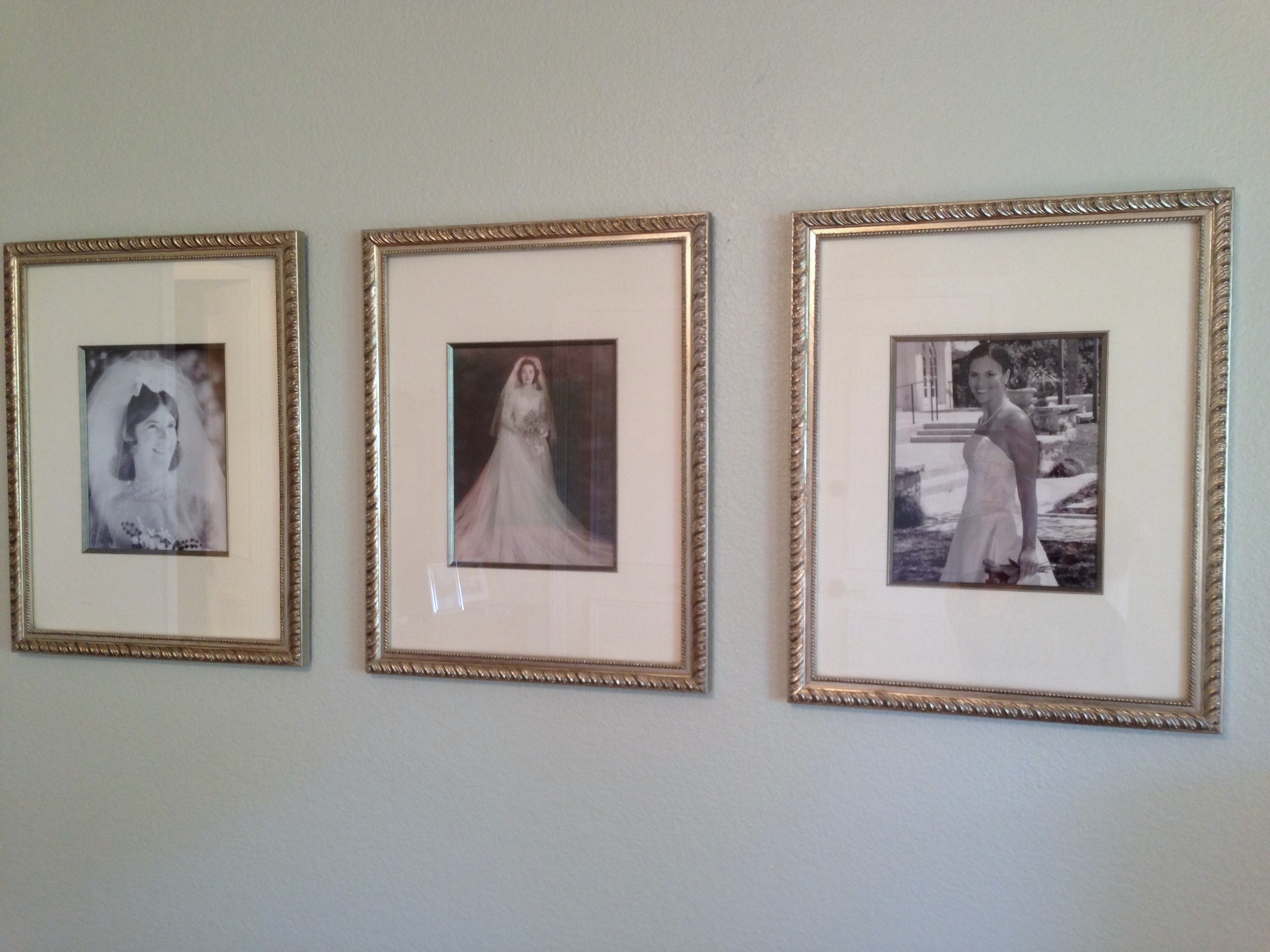 Speaking of pretty and sentimental, remember that one solid wall I have?  That is where I hung the wedding portraits taken of my mother, her mother and me.