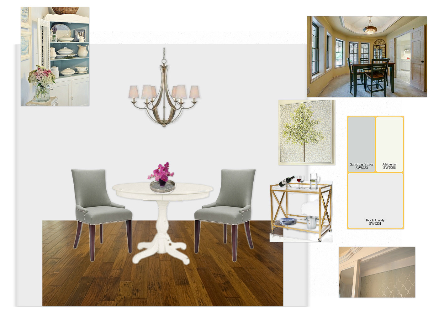 Recently, a super fun newlywed couple asked if I would help them decorate their kitchen and dining room. Not only was I honored to get the job, but I was excited I had a good excuse to surround myself with mountains of tile samples, paint colors and fabrics galore (Yes, I know I need to get out more). On Sunday I presented my design plan to my clients and what do you know – they loved it! Hooray!