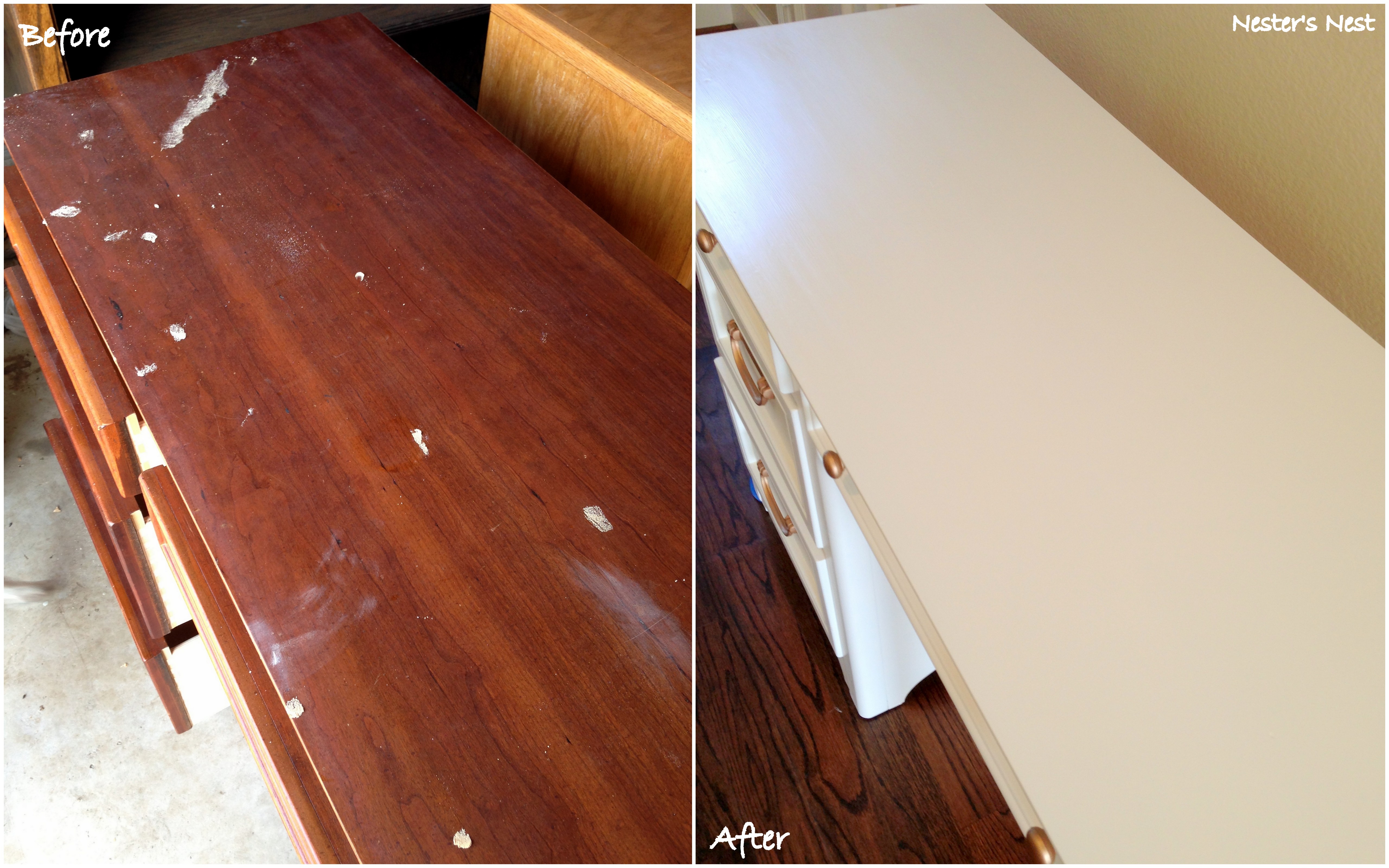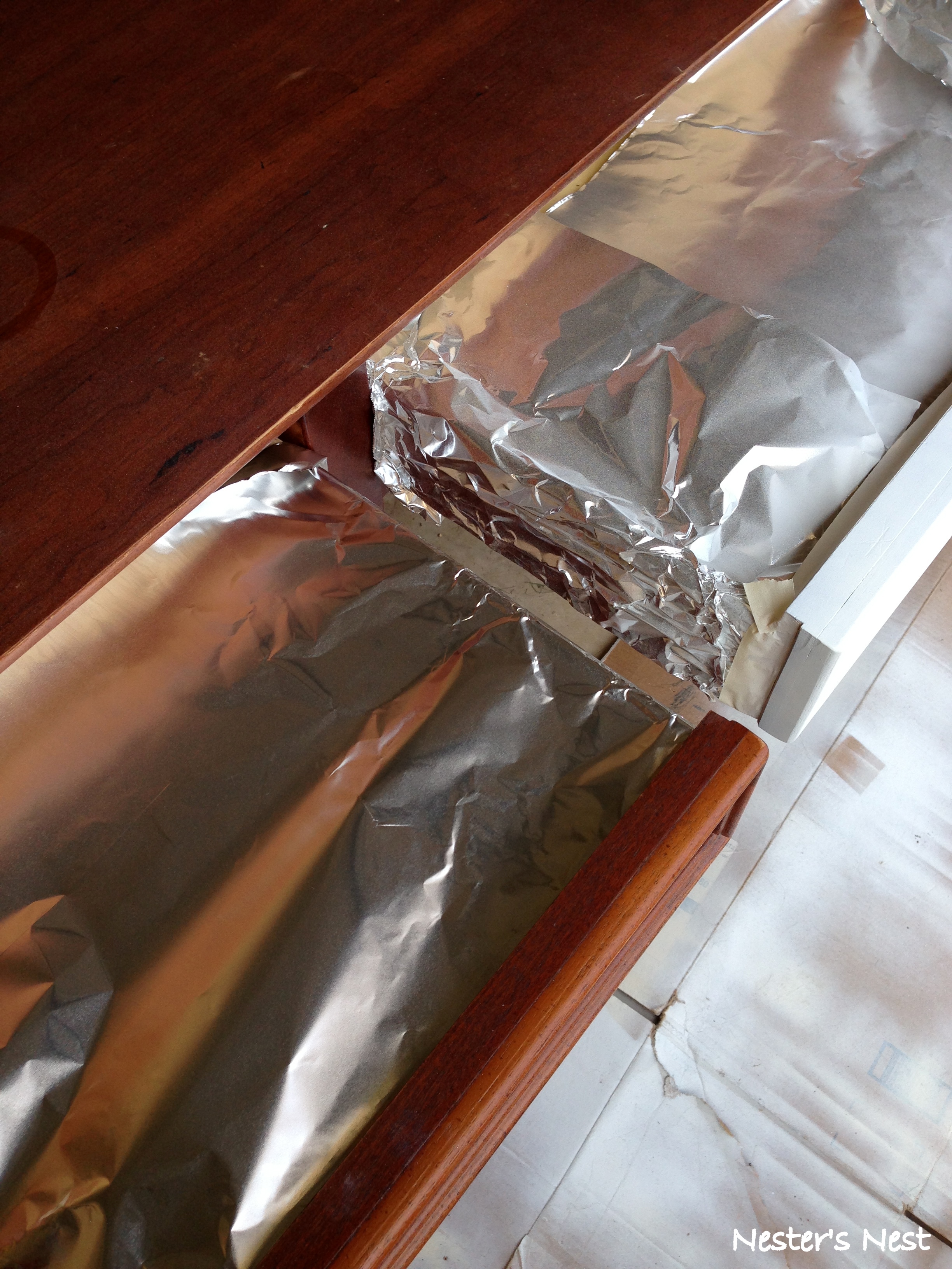 Once I began the prep work, I came across a problem I had never encountered before. I could not remove the desk drawers. It was literally impossible. I finally came to the realization that in order to remove the drawers I would have to remove the backing on the desk, which was not only screwed in, but also stapled. So, I came up with plan B….tin foil.