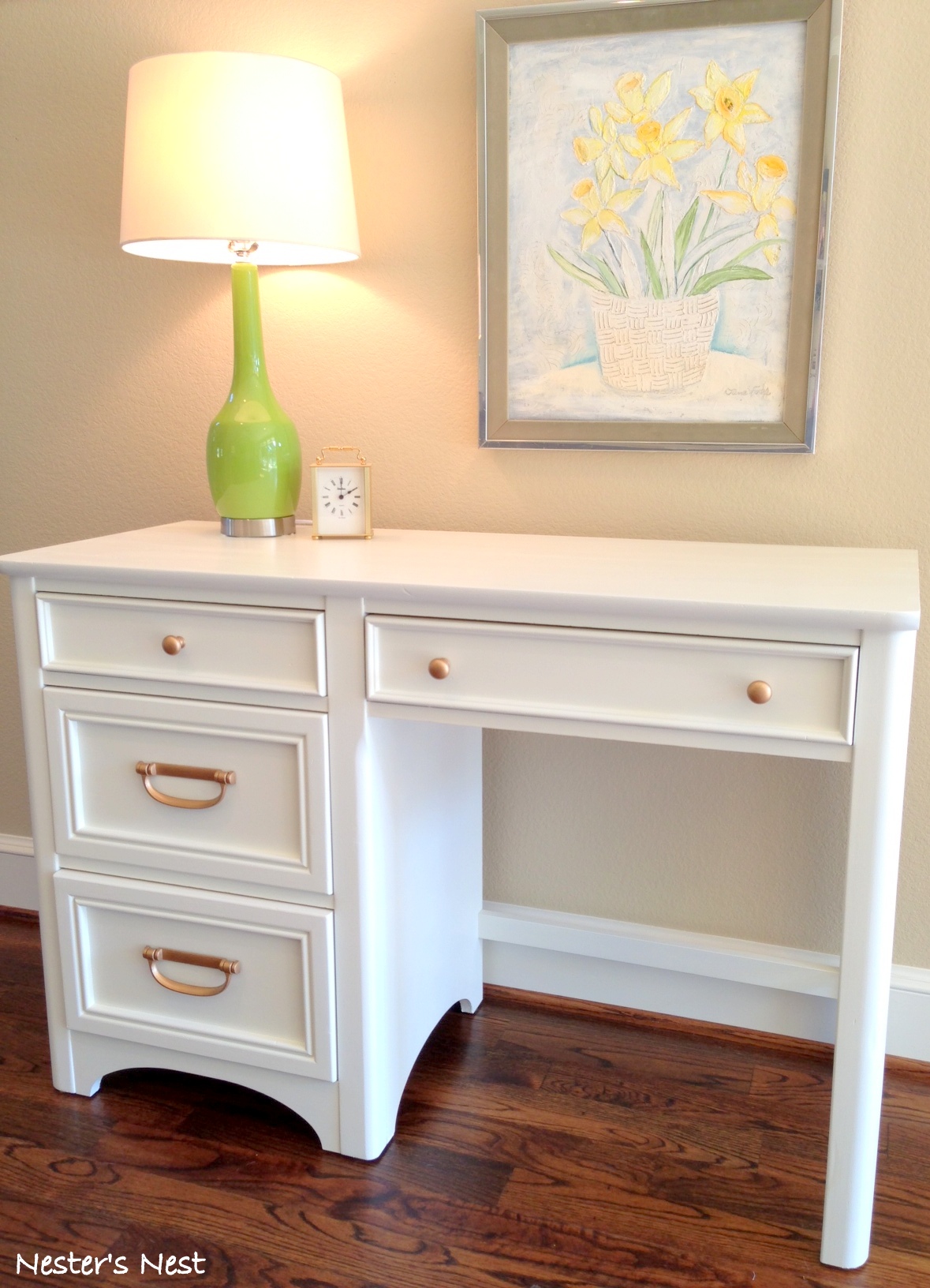 While waiting for the desk to dry I used my trusty Rub-N-Buff in Antique Gold to freshen up the hardware. To keep the finish in tact I followed up with two coats of clear gloss protectant.