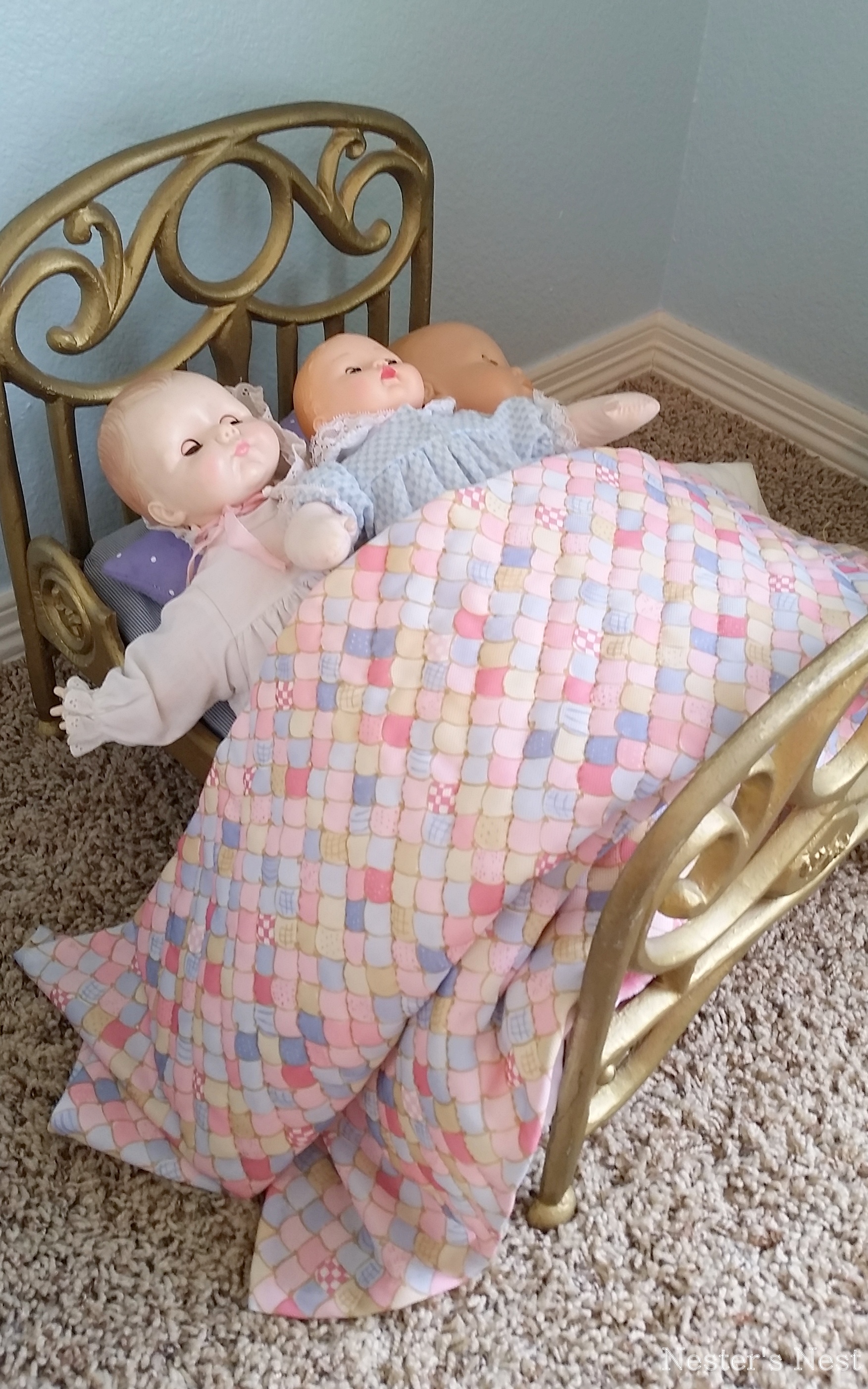 In the corner you will find a metal doll bed my grandmother painted for me when I was a small child. She even sewed the bedding herself. The doll on the left was mine and the one in the middle is the Baby Huggums from Madame Alexander my mother gave to my daughter when she was born (who needs American Girl?)